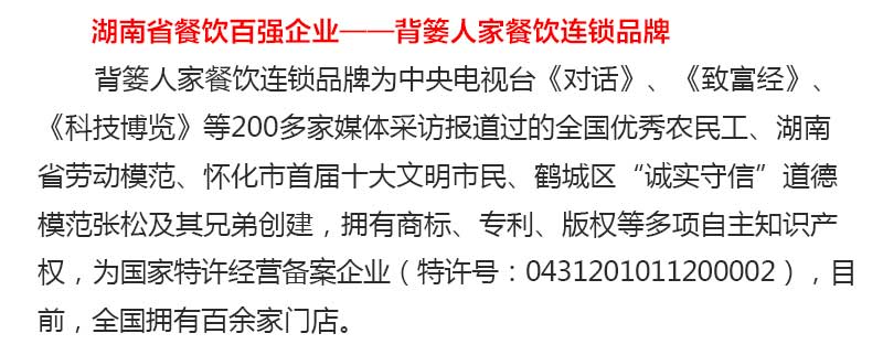 懷化市背簍人家餐飲連鎖管理有限公司為中央電視臺《對話》等200多家媒體采訪報道過的全國優(yōu)秀農(nóng)民工、湖南省勞模、鶴城區(qū)“誠實守信”道德模范張松及其兄弟創(chuàng)建,擁有商標(biāo)、專利、版權(quán)等多項自主知識產(chǎn)權(quán),為國家特許經(jīng)營備案企業(yè)(特許號:0431201011200002)。